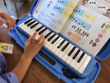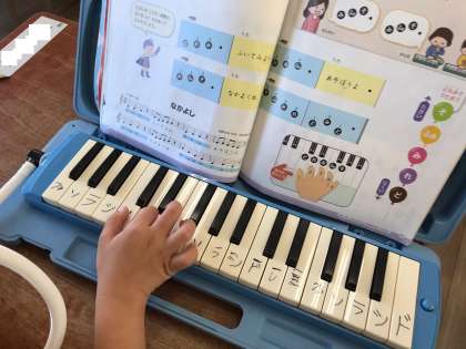 鍵盤ハーモニカの練習をしました。「どんぐりさんのおうち」や「なかよし」の曲に合わせて、鍵盤ハーモニカの演奏をしました。