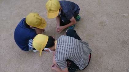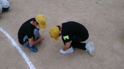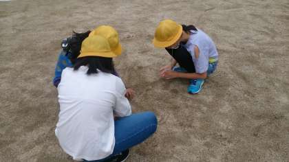 児童朝会で運動場の石ひろいをしました。子どもたちは一生懸命に石をひろっています。