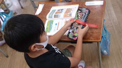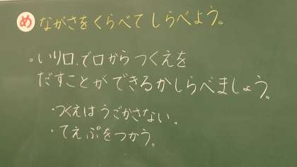 「ながさをくらべてしらべよう」の学習をしました。身の回りにあるものの長さをテープを使って比べています。