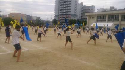 運動会の演技の練習をしました。フラッグでの集団演技に取り組んでいます。全身を大きく使って演技しています。