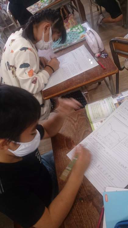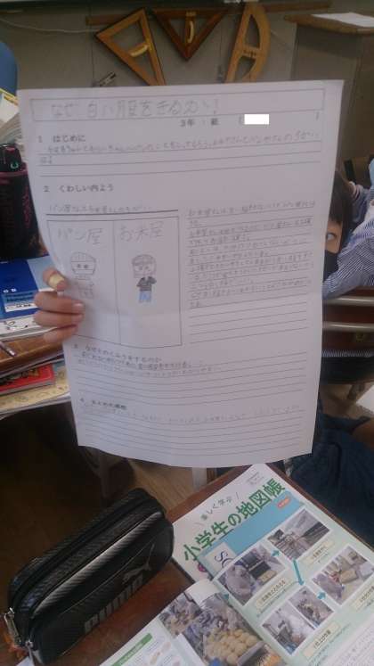 社会科新聞を書いています。社会科は、社会事象について考える学習です。社会科新聞の中に、調べたことのわけや理由が書かれています。読みやすくするためのイラストも工夫して描いています。