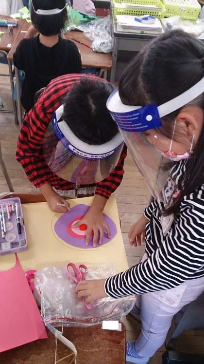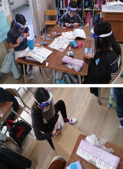 「おもちゃ図鑑」から動くおもちゃを作る活動しています。グループで試作したおもちゃを動かして調整しています。