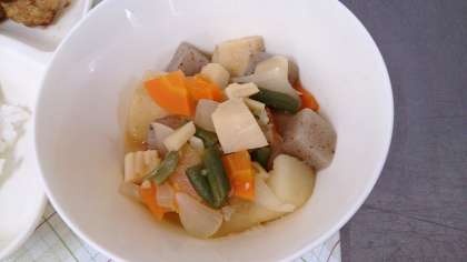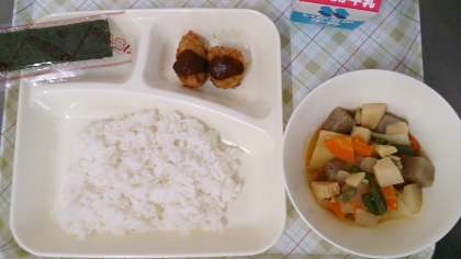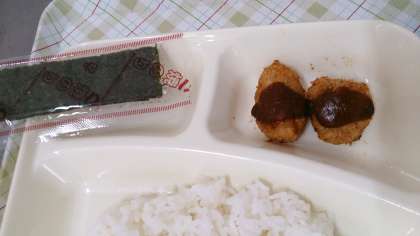 今日の給食は、みそカツ、じゃがいもと野菜の煮もの、焼きのり、ごはん、牛乳です。