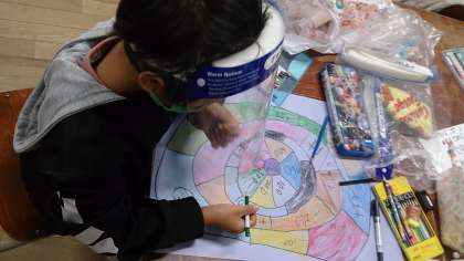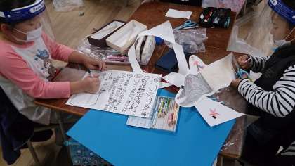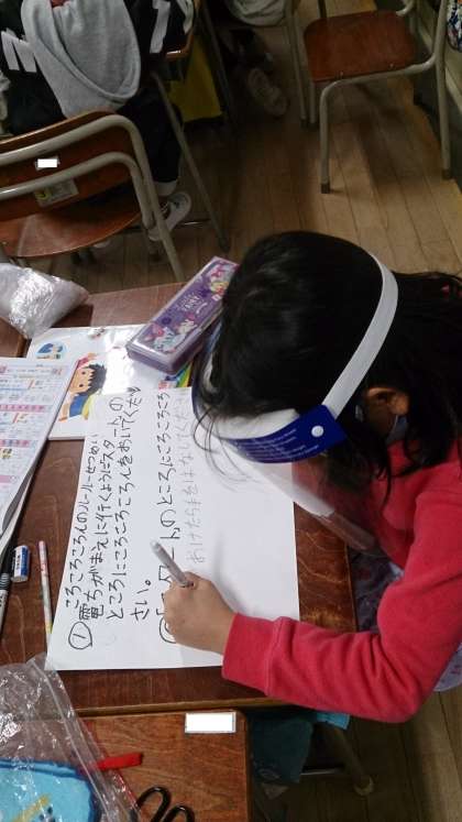 「おもちゃ図鑑」の動くおもちゃづくりをしています。今日は、ゲームのルールを画用紙に書いているグループもいます。