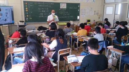 教頭先生と一緒に日本の工業のさかんな地域について学習しました。工業地域や工業地帯など、特色について学んでいます。