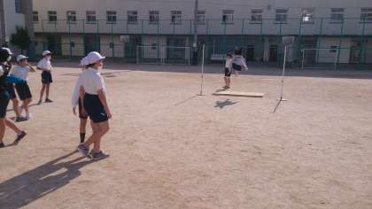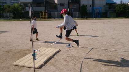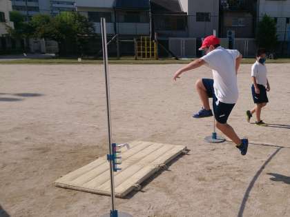 走り高跳びの運動に取り組んでいます。個々の目標に向けて、グループで協力しています。写真は、昨日の体育の時間の様子です。