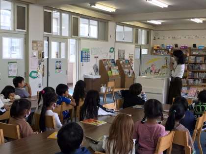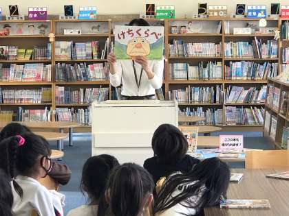 図書館補助員さんに、読み聞かせをしていただきました。大型絵本「ちいさなきいろいかさ」と紙芝居「けちくらべ」です。わぁと歓声が上がったり、くすくす笑い声が聞こえたり、楽しい読書の時間になりました。