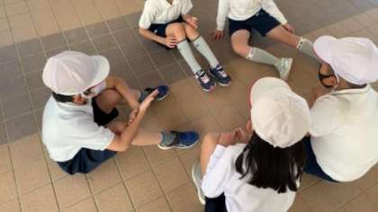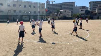 ボール運動に取り組んでいます。作戦を立てて、チームごとに戦っています。