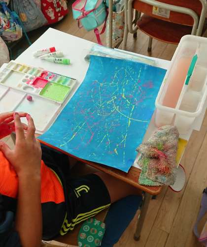 ビー玉に絵の具をつけて転がし、模様をつけました。