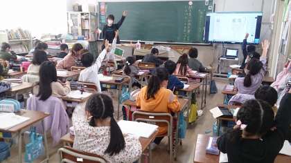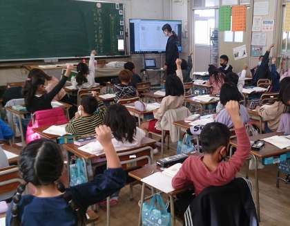 単元「お話を考えて書く」の学習をしています。3枚の絵から想像を広げて構成を考えてお話を書いています。