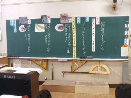 虫「ケラ・カマキリ・チョウ」の体の働きについて、人間の道具と比べて読み取りをしました。学習中も、たくさんの子どもたちが、積極的に挙手して発表し、ワークシートにも丁寧にまとめていました。