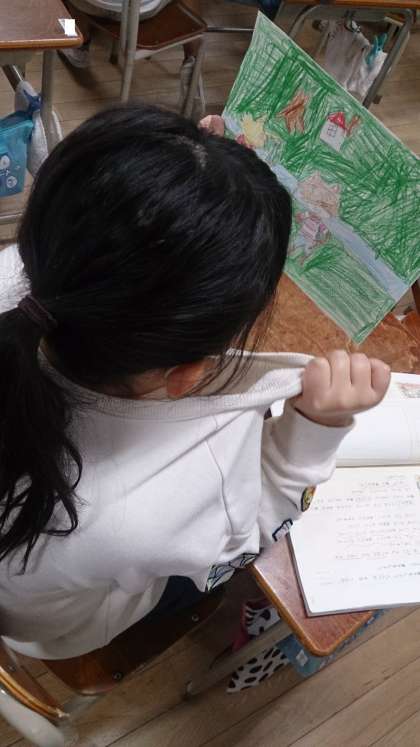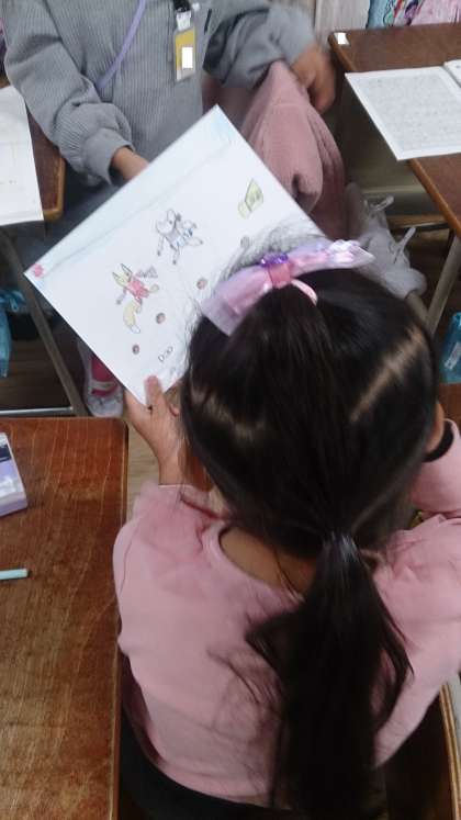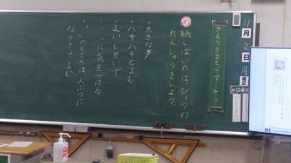 紙芝居の発表の練習をしました。「よいしせいで」「はきはきと読む」など、めあてに向けて練習しています。