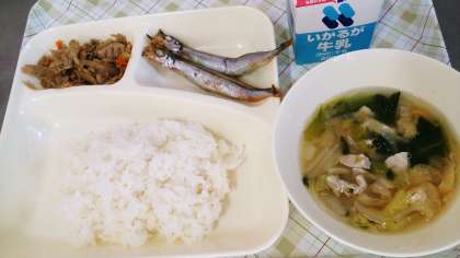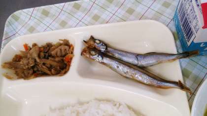今日の給食は、焼きししゃも、五目汁、きんぴらごぼう、ごはん、牛乳です。
