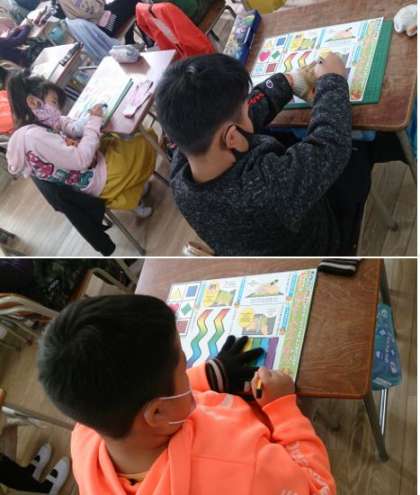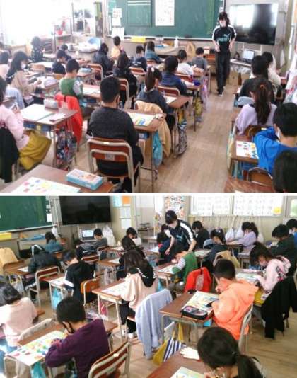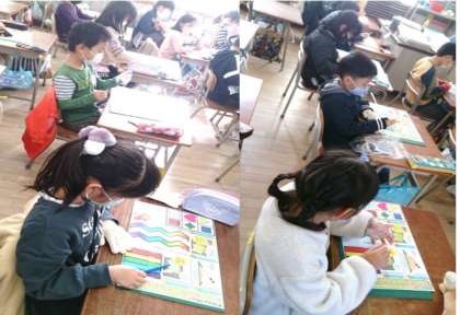カッターナイフの使い方を学習しました。軍手をして、練習用紙を慎重に切っています。