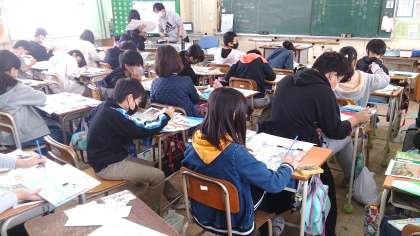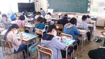 浮世絵の描画に取り組んでいます。色合いを工夫して、細かに描写をしています。