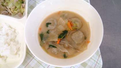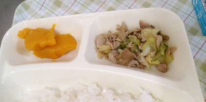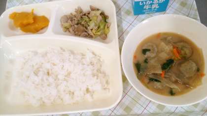 今日の給食は、豚肉とまいたけのいためもの、つみれ汁、かぼちゃういろう、ごはん、牛乳です。