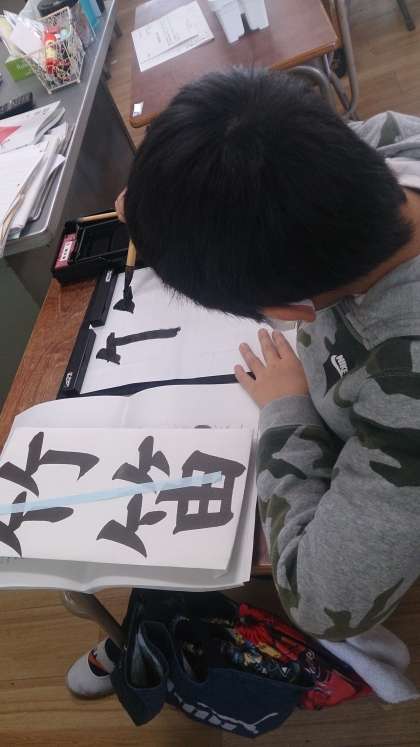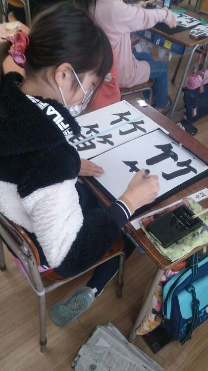 「竹笛」を毛筆でかいています。上下の部分の組み立て方に注意してかきます。