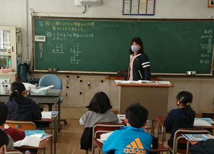 1.2×43の筆算のしかたを学習しました。小数点はどこにつけるのか、それはなぜなのか、みんなで考えました。