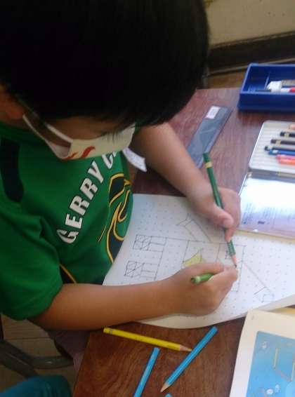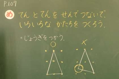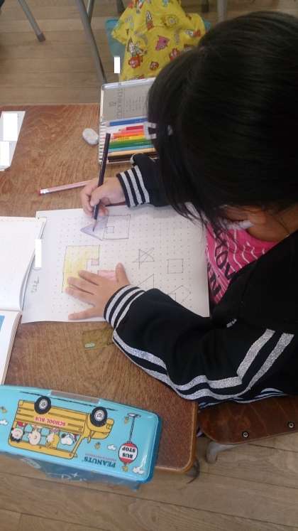 てんとてんをせんでむすんでかたちをつくる学習をしました。定規を使ってかたちづくりをしています。かたちをつくった後は、色をぬっています。