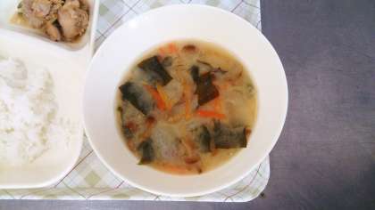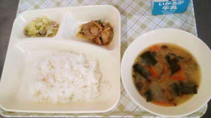 今日の給食は、鶏肉のごまだれ焼き、なめこのみそ汁、キャベツのいためもの、ごはん、牛乳です。