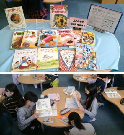 読書活動に取り組みました。静かに、本を読んでいます。図書館支援員さんが、「食育」関係の本を展示コーナーで紹介しています。