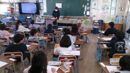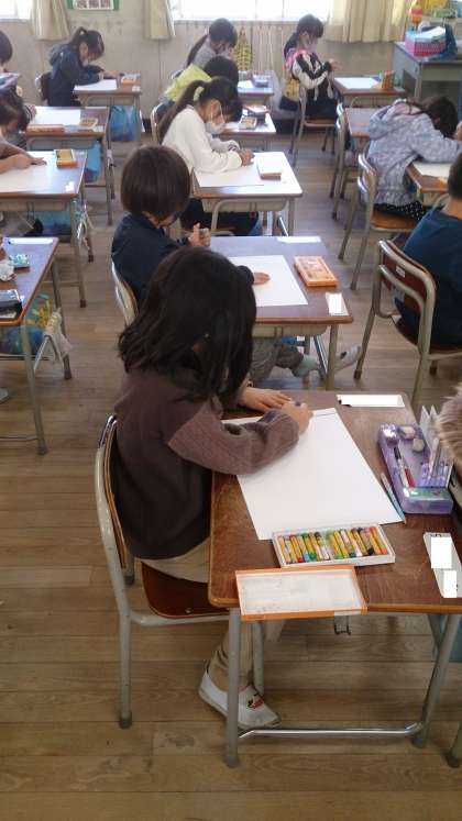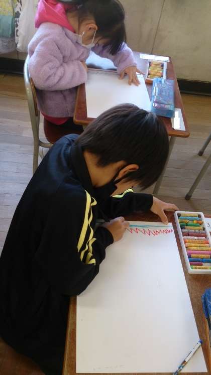 いろいな線を描きました。自分の好きな色を選んで、直線やジクザクなどの線を描いています。