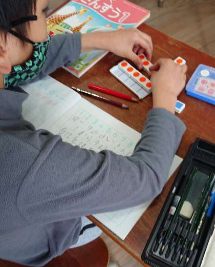 12−7の計算を学習しました。ブロックを使いながら考えています。