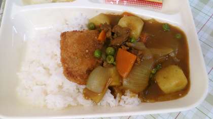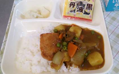 今日の給食は、カツカレーライス、カリフラワーのピクルス、いり黒豆、牛乳です。