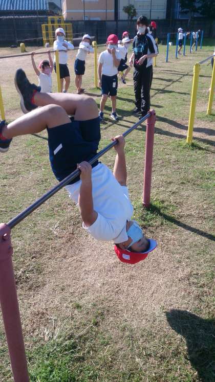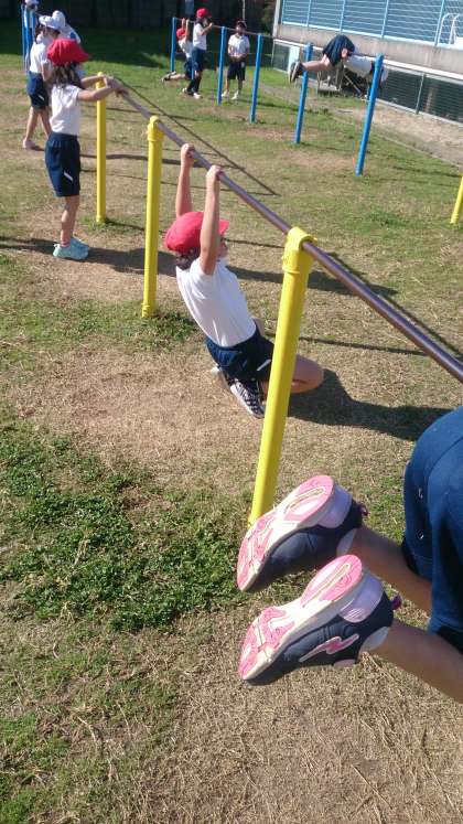 鉄棒運動を使った運動遊びに取り組んでいます。鉄棒で体を支える、回転する、逆さになるなどの動きを遊びを通して体験する運動です。