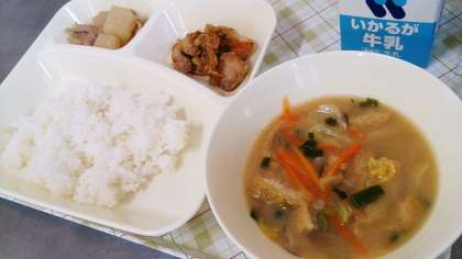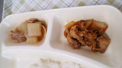今日の給食は、鶏肉の甘辛焼き、みそ汁、だいこんの煮もの、ごはん、牛乳です。