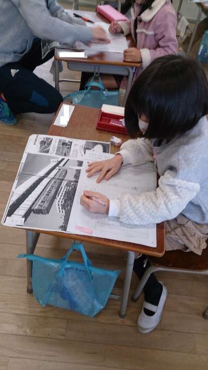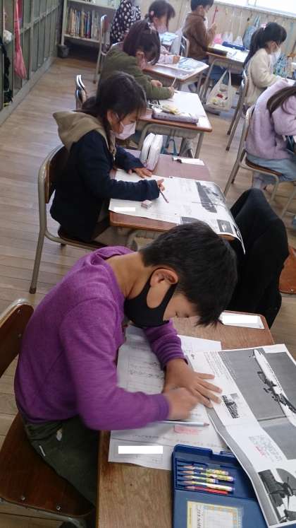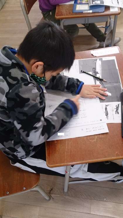 自分の好きな乗り物のことを調べました。とても集中して文章を書いています。