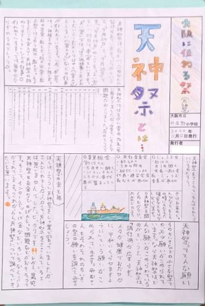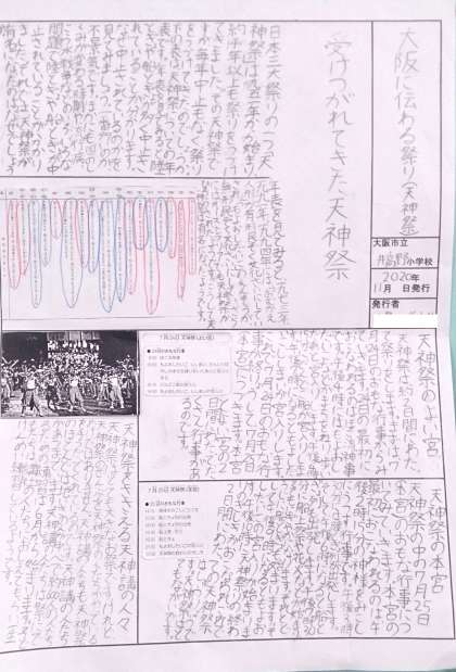 社会科新聞をつくりました。天神祭りの宵宮や本宮などとても詳しく紹介しています。祭りを支えている住民の方たちの願いや活動の様子も記事にしています。