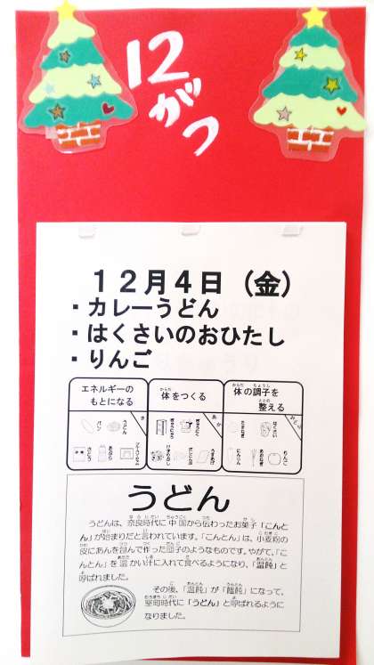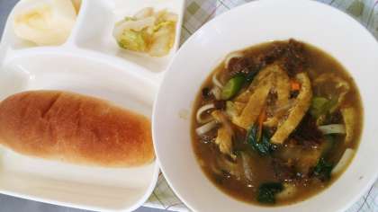 今日の給食は、カレーうどん、はくさいのおひたし、りんご、パン、牛乳です。