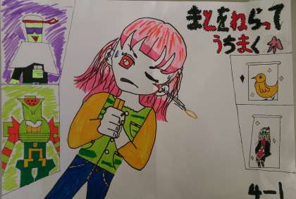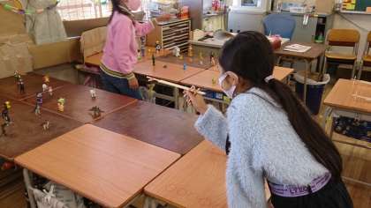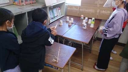 4年生は、射的とスプーンリレーを出店しました。射的では、割りばしゴム鉄砲で、まとを狙います。写真は、射的をしている様子です。