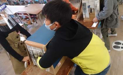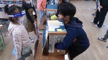 1年生は、はてなボックスと宝探しを出店しました。写真は、ボックスの中に手を入れている様子です。