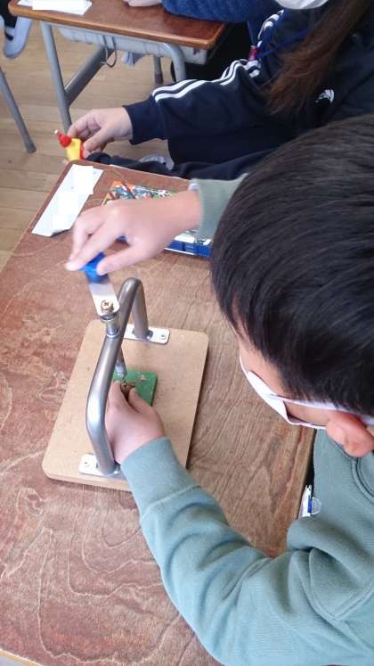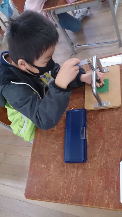 どんぐりごまを作っています。集中して穴をあけています。