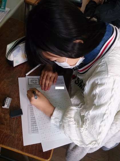 卒業アルバムの文集づくりに取り組んでいます。とても丁寧に清書しています。