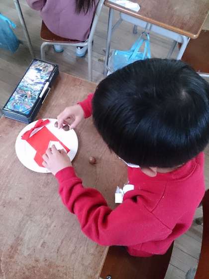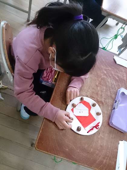 クリスマスの飾りを作りました。どんぐりでデコレーションしています。真ん中には、サンタさんがいます。