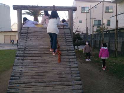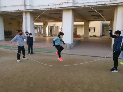 登校後、朝の時間に、子どもたちは元気に遊んでいます。運動場では、6年生が、ダブルダッチをしていました。跳ぶのも縄を回すのも難易度が高いのですが、とても楽しく遊んでいました。3年生は、遊具で遊んでいます。