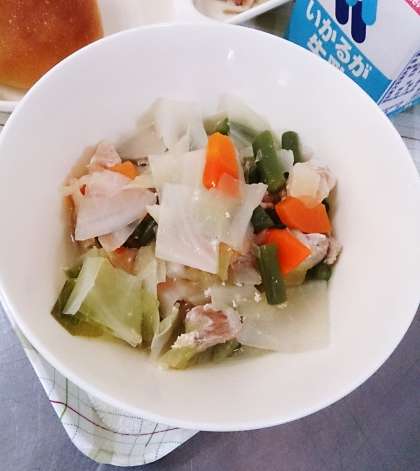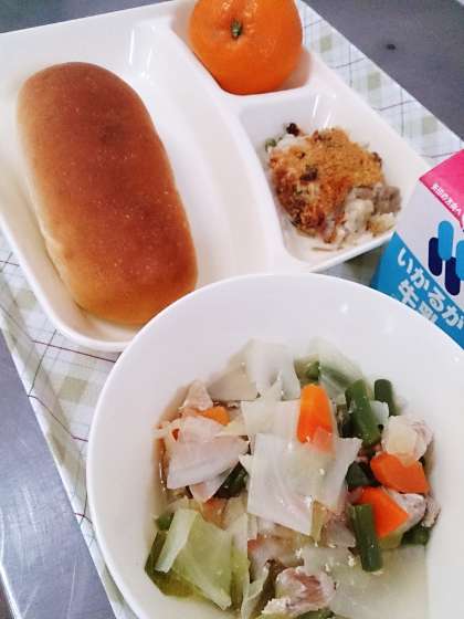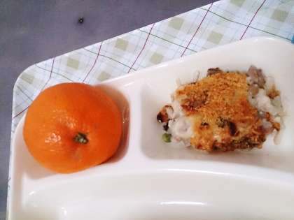 今日の給食は、鶏肉とじゃがいものスープ煮、きのこのドリア、みかん、パン、牛乳です。