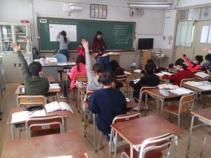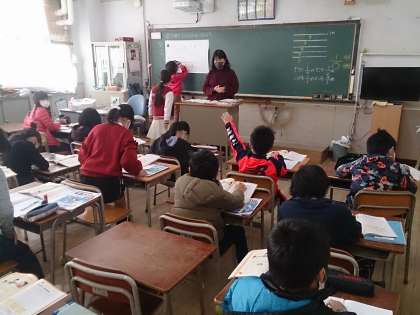 単位分数の意味を、テープ図と数直線でとらえていきます。どの教室も活発に発表しています。