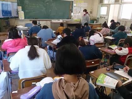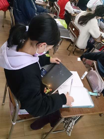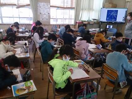 映像を見た後、教科書を使って調べています。