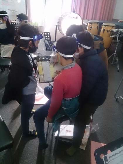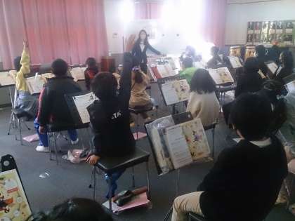 公開授業がありました。音の組み合わせ方や重ね方を工夫して、「まほうの音楽」をつくる学習です。グループで相談して音を出す順番や繰り返し、強弱などを決めています。