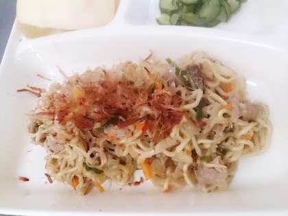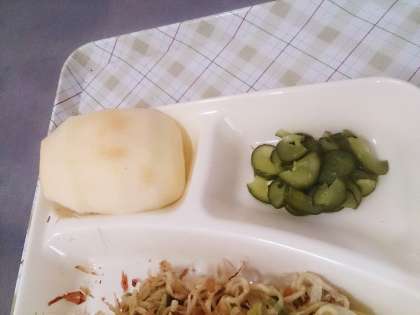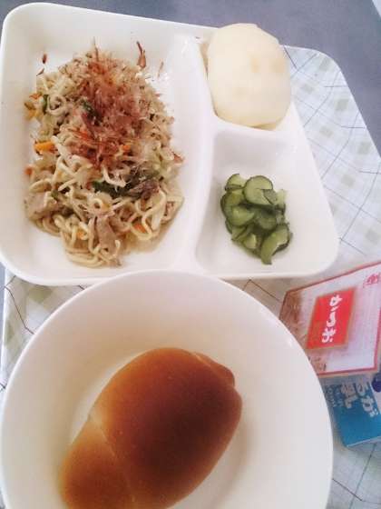 今日の給食は、和風焼きそば、きゅうりの甘酢あえ、りんご、パン、牛乳です。