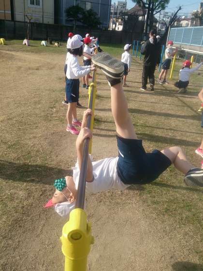 鉄棒を使った運動遊びでは、支持や回転など身に付けた動きを工夫して運動遊びを楽しく行ことが目標になります。