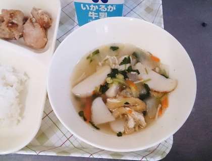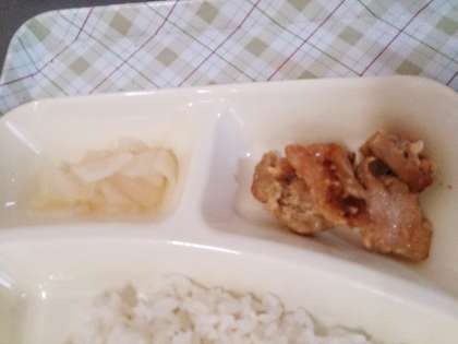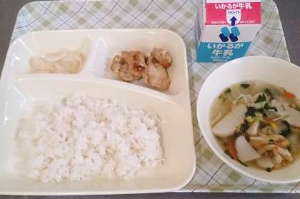 今日の給食は、鶏肉のしょうゆマヨネーズ焼き、五目汁、かぶのゆず風味、ごはん、牛乳です。