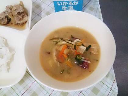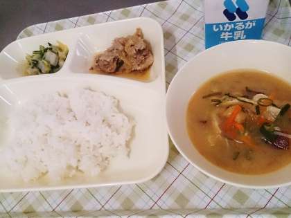 今日の給食は、豚肉のしょうが焼き、さつまいものみそ汁、きくなとはくさいのごまあえ、ごはん、牛乳です。