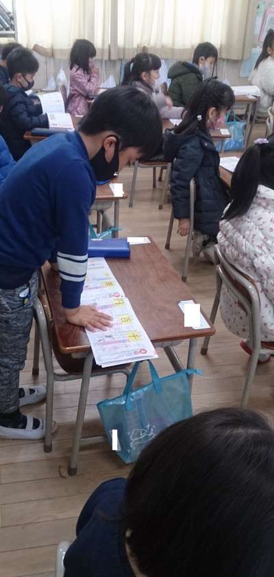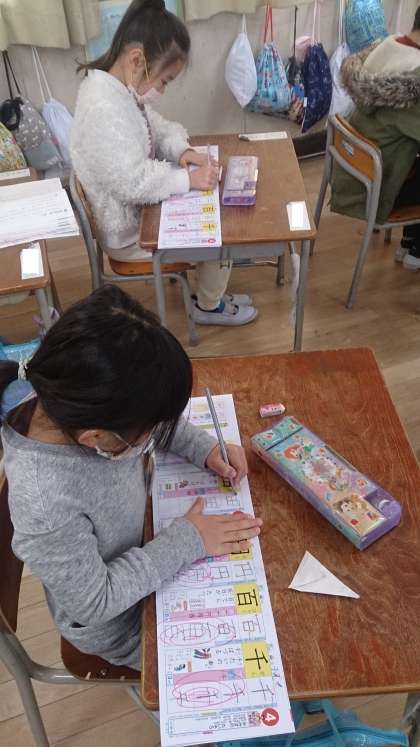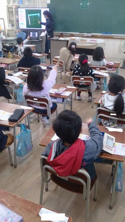 新しい漢字を学習しました。「田」の書き順や読み方などを学んでいます。しっかりと空書きして書き順を覚えています。発表もとても活発です。