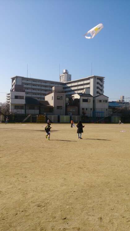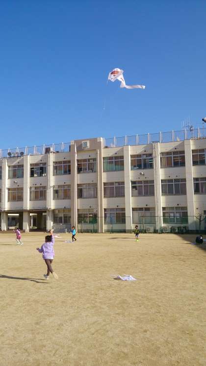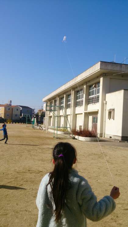 凧を作りました。澄み切った青空に、子どもたちの凧が高く舞い上がっています。
