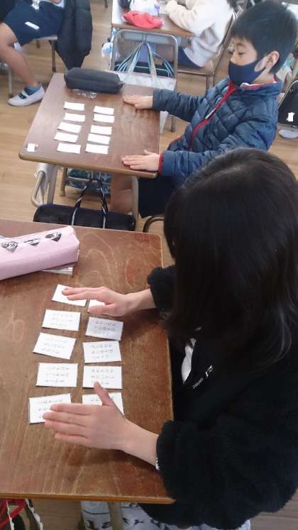 百人一首の練習をしました。上の句の詠みはじめで、下の句の札を素早くとる子もいます。これからの対戦が楽しみですね。